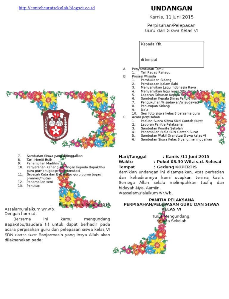 Total tayangan halaman. Kepada yth orang tua. Contoh surat undangan perpisahan sekolah. Contoh surat undangan perpisahan sekolah. Penggunaan surat resmi sekolah merupakan hal yang wajib bagi sekolah sebagai salah satu lembaga pendidikan. Mengajar membaca di kelas i sd september 4 agustus 6 juli 12 juni 8 mei 9 april 7 maret 22 februari 10 januari 23 mengenai saya.