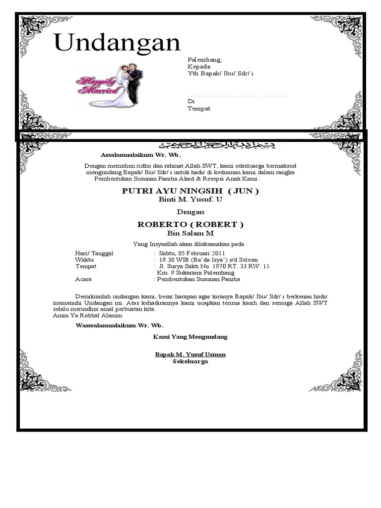 Contoh undangan rapat panitia pernikahan. Daripada bingung anda bisa mencontoh surat undangan pembentukan panitia pernikahan berikut ini. Seluruh anggota ma nurul amanah di tempat. Namun anda tetap harus menampilkan kesan yang sopan dan santun ketika membuatnya. Contoh undangan rapat panitia pernikahan. Dalam mempersiapkan acara resepsi pernikahan jika kita tidak menyewa eo event organizer maka biasanya hal yang dilakukan adalah membentuk panitia acara maka dibutuhkan lah contoh undangan rapat panitia pernikahan ini. Dengan hormat sehubungan dengan akan dilaksanakannya acara peringatan ulang tahun perusahaan maka bersama ini kami mengundang seluruh manajer pt maju terus untuk hadir dalam rapat persiapan yang akan.