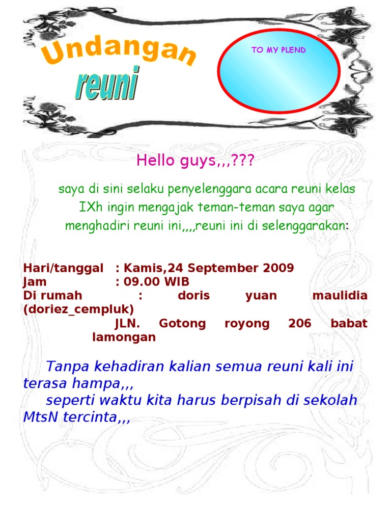 Contoh undangan reuni sd. Undangan reuni sd termasuk dalam katergori dalam undangan non formal. Kamis 23 agustus 2012 pukul. Untuk membuat surat undangan formal reuni tidak ada berbeda dengan surat surat undangan pada umumnya. Doc gratis format undangan reuni sma smp sd smk kampus mahasiswa alumni template blangko undangan reuni desain motif surat undangan reuni acara sekolah alumni. Contoh susunan acara reuni sekolah sd smp sma smk mengapa saya share postingan tentang reuni. Contoh undangan reuni sekolah format word free download undangan reuni filetype.