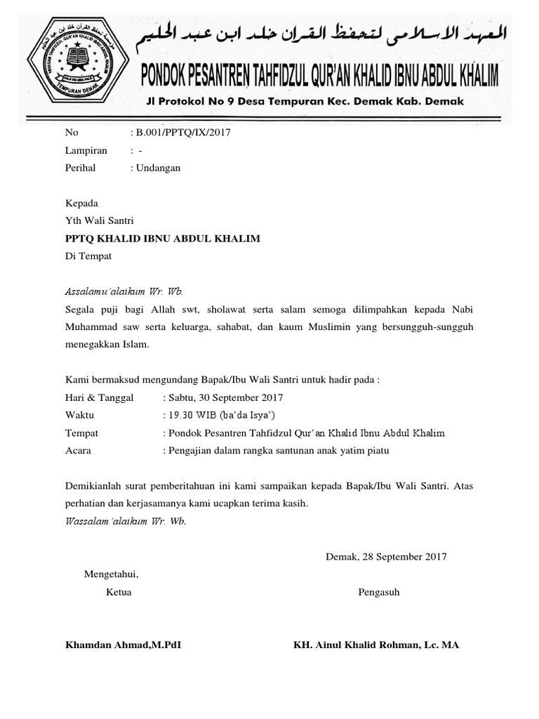 Contoh undangan santunan anak yatim. Kegiatan ini akan diisi dengan ceramah motivasi santunan anak yatim sekaligus buka bersama yang akan dihadiri oleh anak anak yatim dan dhuafa serta simpul simpul umat. Contoh undangan santunan anak yatim contoh surat. Tempat dan waktu kegiatan santunan anak yatim dan dhuafa ini akan dilaksanakan pada hari ahad 23 ramadhan 1433 h 12 agustus 2012 m. Contoh surat undangan santunan anak yatim scribd. Nah itu dia contoh surat permohonan bantuan kegiatan santunan yatimpiatu dan dhuafa silahkan jika yang memerlukannya bisa menggunakannya dengan menambahkan dan mengurangi beberapa kalimat yang tidak dibutuhkan bagi anda yang membutuhkan contoh surat lainnya silahkan cek tentang surat pengantar proposal. Zikir dan doa bersama.