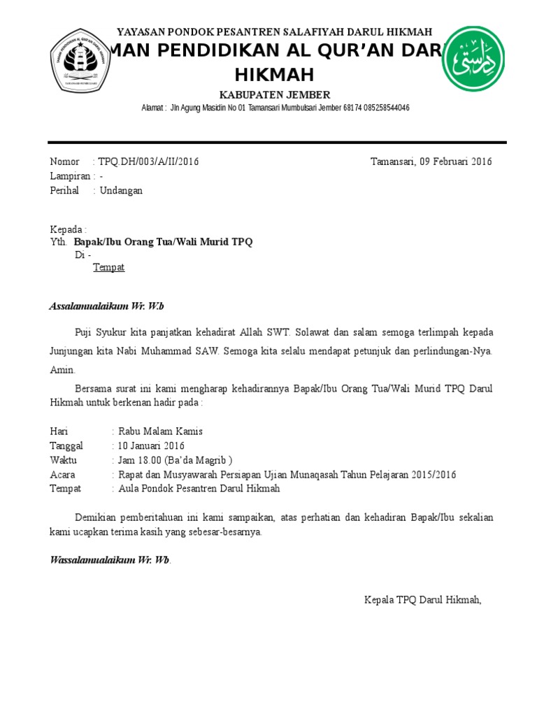 Format surat tentunya memuat kop sekolah madrasah kepala surat isi surat serta penutup serta harus diketik dengan rapi dan jelas khususnya waktu tanggal tempat dan kegiatan agar surat undangan tersebut efektif tentunya juga harus bubuhi. Contoh surat undangan rapat waliorang tua murid tk surat undangan adalah sebuah surat yang dikirim kepada seseorang agar orang yang dimaksud datang pada waktu tempat acara yang telah ditentukan.