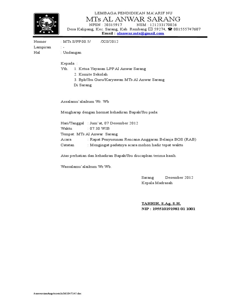 Contoh undangan wali murid. Atau bisa juga berupa surat undangan rapat membahas admisnistrasi sekolah smk tahun 20172018. Surat undangan merupakan surat yang sifatnya mengajak seseorang pejabat lembaga untuk hadir dalam suatu acara. Dengan hormat bersama dengan surat ini kami mendoakan semoga bapakibu sekeluarga selalu dalam keadaan sehat walafiat serta selalu dalam lindungan nya. Keduanya memiliki karakteristik yang berbeda dan digunakan untuk keperluan yang tidak sama. Contoh surat undangan resmi dari sekolah salah satu surat resmi yang sering kali kita temui dari sekolah adalah surat undangan untuk para orang tua wali murid untuk menghadiri salah satu acara yang diadakan di sekolahsurat undangan ini termasuk merupakan salah satu surat resmi atau surat dinas sekolah yang harus menggunakan tata bahasa yang formal dan tertata rapi sehingga mudah dimengerti. Atau bisa juga berupa surat undangan rapat membahas admisnistrasi sekolah smk tahun 20182019.