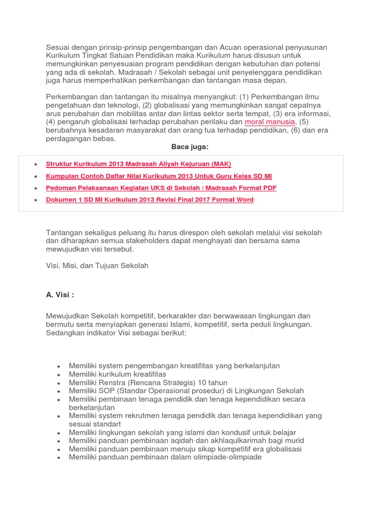 Oleh karenanya ketika ingin menyusun visi dan misi terutama untuk sekolah dasar kita perlu memahami apa saja yang menjadi tujuan sekolah dan apa saja upaya yang dilakukan untuk mewujudkan tujuan tersebut. Terwujudnya peserta didik yang beriman cerdas terampil mandiri dan berwawasan global. Dalam rangka implementasi selanjutnya semua kegiatan sekolah harus disesuaikan dengan tuntutan kurikulum 2013 tersebut. Kikd kurikulum 2013 sdmismpmtssmama 20162017 kumpulan permendikbudkurikulum 2013lengkap aplikasi dan administrasi guru yang mana file berikut ini adalah kumpulan dari berbagi sumber tentang visi dan misi umkm makanan yang bisa bapakibu gunakan dan diunduh secara. Membina peserta didik unggul dalam prestasi akademis dan non akademis di taraf nasional maupun internasional. Visi unggul dalam prestasi berkarakter berbudaya peduli lingkungan berwawasan global yang dilandasi iman dan takwa.