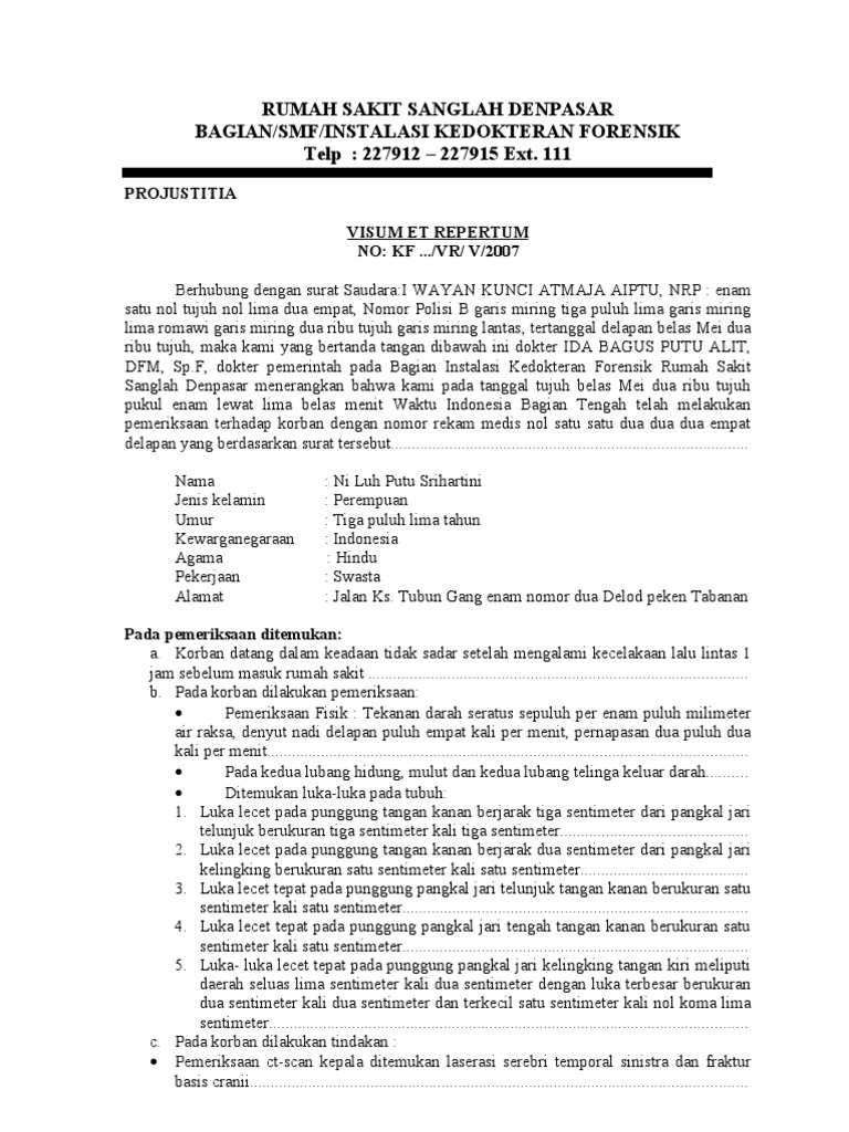 Susunan visum et repertum ada 5 bagian visum et repertum yaitu. Surat keterangan visum et repertum korban hidup departemen kedokteran forensik medikolegal kfm fakultas kedokteran universitas hasanuddin rs pendidikan universitas hasanuddin jl. Contoh visum et repertum. Contoh surat visum et repertum ver surat visum et repertum vr adalah sebuah surat yang secara resmi dikeluarkan oleh pihak tenaga ahli dokter forensik atau dokter perihal pemeriksaan yang dilakukan terhadap luka luka atau jenazah yang nantinya dalam surat ini akan dijelaskan sebuah kesimpulan yang mendeskripsikan bentuk jenis beratnya sebuah luka dalam sebuah.