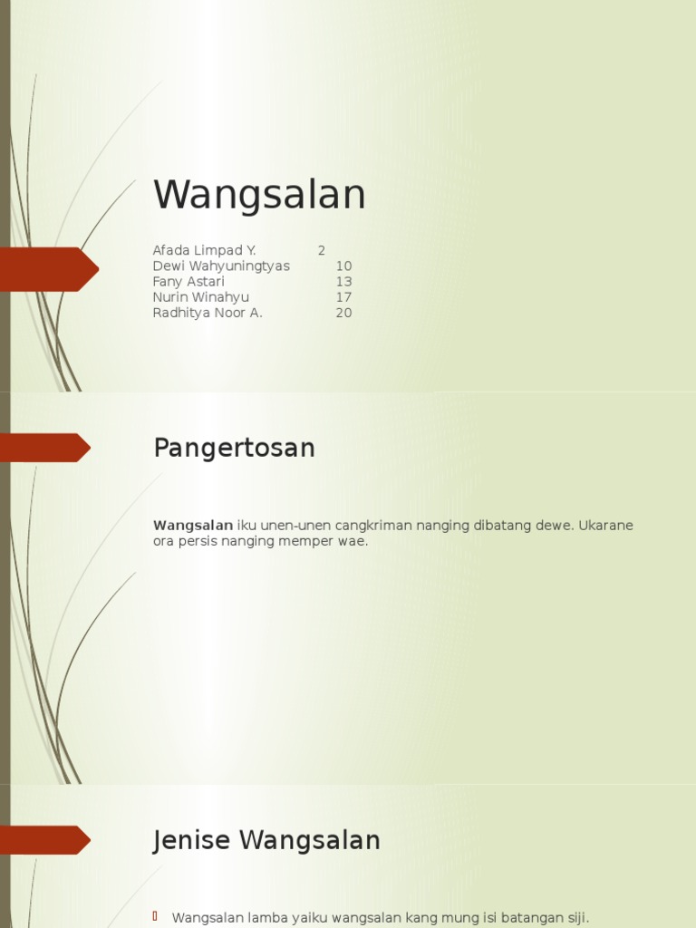 Njanur gunung esuk esuk kowe wis teka mrene. Jenang gula kowe aja lali jenang gula. Jika kalian belum banyak mengetahui tentang bahasa jawa jangan khawatir di artikel ini ada banyak informasi terkait wangsalan yang bisa kalian pelajari. Berikut ini pengertian wangsalan jenis jenis wangsalan dan contoh wangsalan dalam bahasa jawa. Ukara kang kapisan yaiku kang isi wangsalan mawa purwakanthi guru swara lan purwakanthi basa utawa purwakanthi lumaksita. Wanda tali ing tembung lintah dianggap wancahane tembung kang surasane alon alonan ya iku tembung satitahe.
