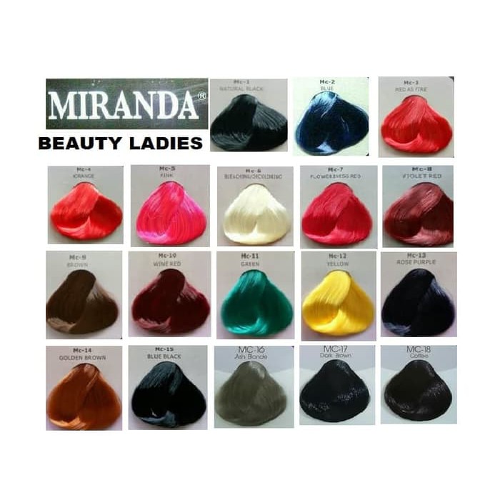 Mc 1 natural black. Mc 2 blue. Mc 6 decoloring bleaching. Produk cat rambut merk miranda juga sudah mulai memasuki jajaran yang cukup tinggi di pasaran indonesia. Mc 7 floweriness red. Macam macam warna cat rambut miranda ada 14 pilihan berbeda dengan harga yang sangat terjangkau yaitu cuma rp8500 per sachet dengan ukuran 30 ml.