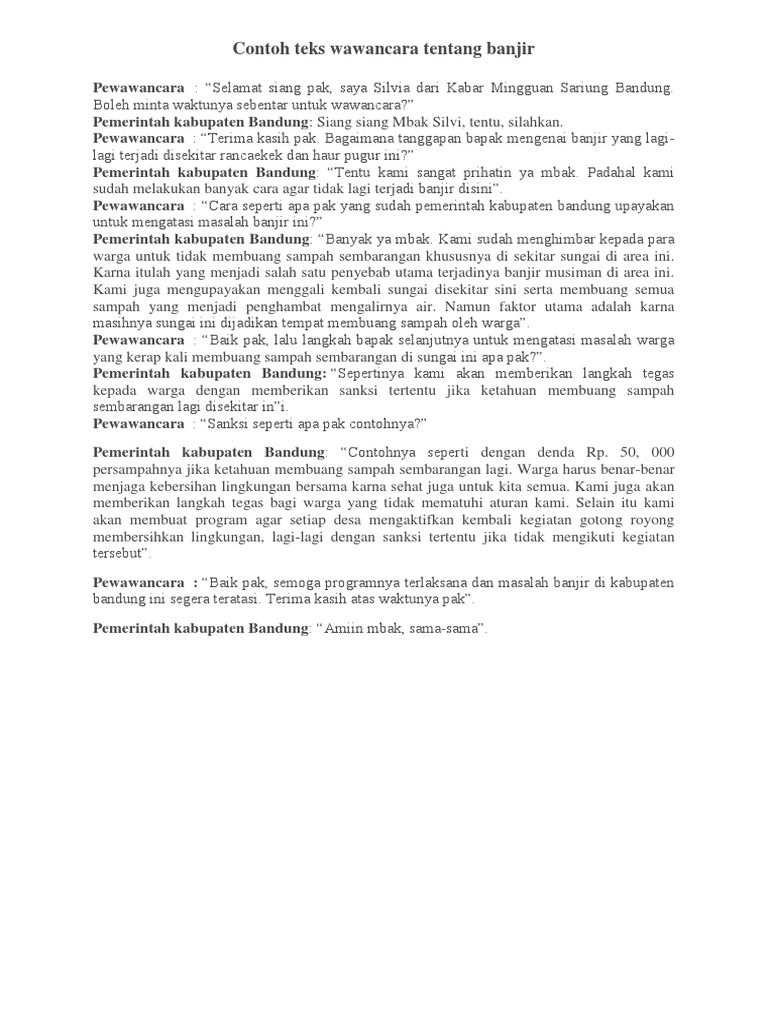 Contoh wawancara tentang kebersihan lingkungan masyarakat. Disatu sisi masyarakat harus sadar akan kebersihan lingkungan salah satunya adalah dengan jangan membuang sampah sembarangan apalagi membuangnya ke sungai. Bisa berbentuk motivasi teguran bahkan ajakan. Pidato dengan tema kebersihan ini bersifat ringkas dan jelas agar penyimaknya tidak bosan dan dapat. Kebersihan lingkungan merupakan hal yang tak terpisahkan dari kehidupan manusia dan merupakan unsur yang fundamental dalam ilmu kesehatan dan pencegahan. Senin 14 november 2019 pukul 1300 1330 wib tempat. Halaman kantor desa cilaban buah batu bandung.