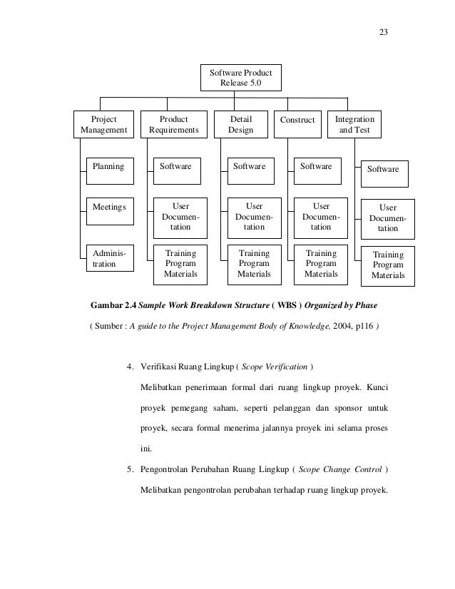 Wbs ini merupakan dokumen fundamnetal dalam manajemen proyek karena menyediakan dasar untuk perencanaan dan mengelola jadawal biaya dan perubahan perubahan yang terjadi. Pada prinsipnya work breakdown structure wbs adalah pemecahan atau pembagian pekerjaan ke dalam bagian yang lebih kecil sub kegiatan alasan perlunya wbs. Anggaran biaya yang dibuat harus dihitung dengan cermat dan akurat dan memenuhi. Definisi dan contoh wbssrk proyek lingkup proyek didentifikasikan sebagai perwujudan dari apa yang diinginkan oleh proyekmisalnya untuk suatu proyek e mk berupa pendirian kilang minyak maka lingkup proyeknya dapat terdiri terdiri dari. Wbs work breakdown structure plays an important role in every construction project. Tugas contoh wbs proyek perangkat lunak.