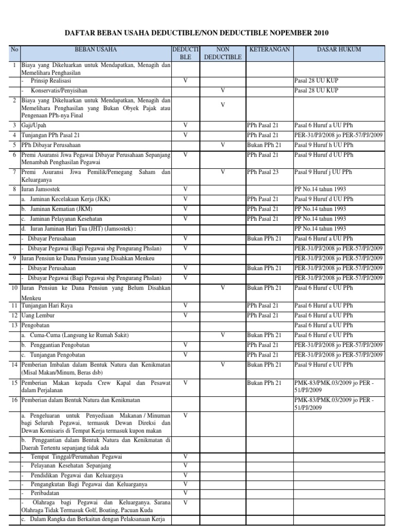 Tabel biaya yang dapat dikurangkan deductible dan yang tidak dapat dikurangkan non deductible no. Deductible expenses adalah biaya biaya yang dapat dikurangkan sebagai pengurang pajak koreksi negative di spt tahunan badan. Home info pajak perbedaan deductible expenses dan non deductible expenses. Pengeluaran pengeluaran yang dilakukan oleh wajib pajak dapat dibebankan antara pengeluaran yang boleh dibebankan sebagai biaya dan pengeluaran yang tidak boleh dibebankan sebagai biaya. Sampai bertemu di pembahasan selanjutnya dan salam artikel.